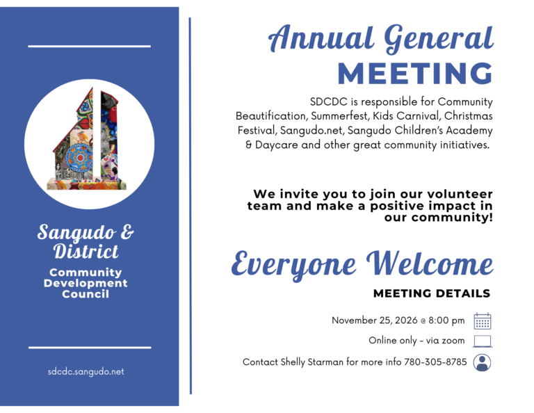 Our next Sangudo & District Community Development Council AGM is scheduled for November 25, 2026 at 8:00pm.